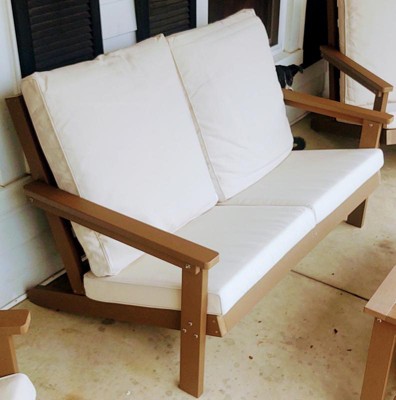 [This review was collected as part of a promotion.] A perfect addition to our backyard space. A sleek, Adirondack style love seat made to take on all of the many seasons Kansas has to offer. The all-weather poly resin will keep this chair looking great for years to come. The cushions are super comfortable and made with sturdy coverimgs. I do wish there were ties to tie down the cushions for windy days. All together, this loveseat is a pretty amazing piece of patio furniture..
