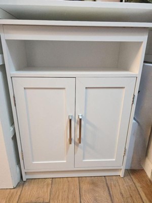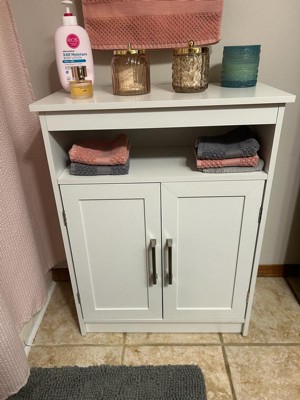 Style and practicality align beautifully in this bathroom floor storage cabinet organizer. Maximize your capacity when you store your room's essentials with this chic space saver. This is the perfect choice for small spaces and adapts to any room in your home. Make a statement by showing off this freestanding cabinet organizer built from premium materials, including sturdy engineered wood with premium metal hinges and door handles that will remind everyone that you take your décor seriously. The fashionable, modern look boasts clean lines for a timeless design. Behind the cabinet doors of this storage cabinet organizer is an adjustable shelf and the doors feature magnetic closures so you can store your items with confidence. The addition of an upper open display shelf doubles as extra storage space or as the perfect display platform for your decor. Each shelf holds up to 55 lbs. static weight and the plastic foot pads on the bottom are engineered to protect your floors. Assembly is quick and easy, typically taking under 60 minutes and maintenance only requires a damp cloth. Organizing your space with flair and efficiency has never been easier.