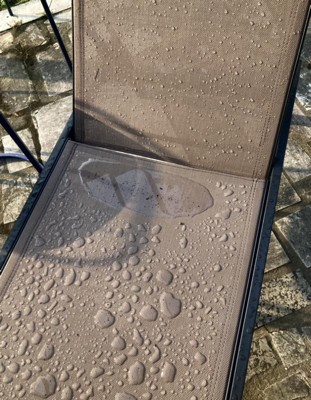 [This review was collected as part of a promotion.] This chair is quite comfortable, and I enjoy having it on my patio. It is long enough for my 6' tall family members and doesn't get hot to the touch in the sun. The downside is that the chair material retains water, and several times I've had to dump it over to get the rainwater off or to try to dry off after being in the pool. Not quite an ideal situation for a pool lounger. Also, the chair was quite difficult to put together since the screw holes of the seat did not exactly line up to the holes on the frame. This was very frustrating and took quite a while to put it together.
