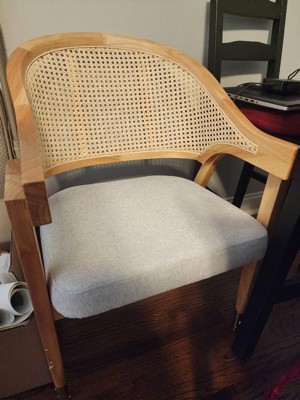 [This review was collected as part of a promotion.] The chair is beautiful and stylish!! I love the natural wood frame, woven cane back, and the neutral upholstered seat that makes it versatile for any room. It feels sturdy, comfortable, and looks high end. However, I had to take off two star because two of the small wood peg on the sides popped out. It doesn’t feel safe since it sticks out and could catch on clothes or even scratch skin. Not kids friendly. Hopefully it’s just a quality control issue, but it’s worth noting. Overall, it’s a great piece with lots of style. Just needs better finishing on the details.