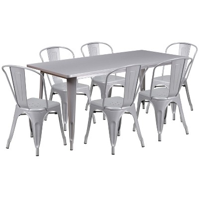 The indoor-outdoor rectangular metal table with six stack chairs will give the dining space in your home or restaurant a cool retro-vintage look. The table top measures 31.5 inches wide by 63 inches long and has a smooth top with a 1 inch edge. A stabilizing brace underneath the top gives this table increased stability while still allowing ample leg room. The bistro style chairs feature curved backs with a vertical slat, and a cross brace under the seat for added support and stability. Plastic bumpers on the cross brace protect the chairs' finish when stacking them. Drain holes in the center of the seat allow water to drain, preventing rust. The smooth, powder coat finish protects the set from scratches and rubber floor glides protect your floors when you need to move it. Designed for both commercial and residential use, this trendy table set will create a lasting impression whether you're serving customers or playing cards with friends. Additional Features: Curved Back with Vertical Slat, Drain Holes in Seat, Cross Brace under seat provides extra stability, Plastic Caps on cross brace protect finish when stacked, Protective Rubber Floor Glides.