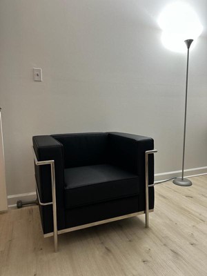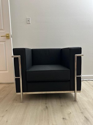 Your office reception space speaks to who your are as a company and this black LeatherSoft upholstered chair with encasing frame makes quite a statement. This trendsetting piece features a straight arm design and a removable square seat cushion, all padded with 5" of foam for exceptional comfort. LeatherSoft is leather and polyurethane for added softness and durability. A stainless steel frame, accent bar enclosure and integrated legs give this chair added strength and a distinctive flair. Make a great impression on your clients, customers, and guests with this innovative contemporary chair. This progressive style chair brings comfort and trend-setting style to your waiting room, reception area or home. Additional Features: Foam Filled Cushions, CAL 117 Fire Retardant Foam, Exposed Accent Bar, Integrated Stainless Steel Frame, LeatherSoft is leather and polyurethane for added Softness and Durability