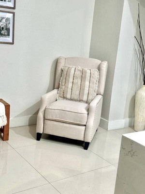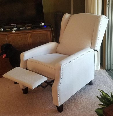 If you're looking to refresh your living room or bedroom and need a comfortable place to sit, look no further. Offering a combination of traditional wingback styling with modern details, this recliner can suit any space or décor. Generously padded and upholstered with easy to clean fabric in soft cream with nailhead accent trim, this chair is equally stylish and comfortable. The easy, push back design means no fussing with buttons or levers and the pop out footrest allows you to truly put your feet up and relax with your favorite TV show or a good book. Assembles in less than 10 minutes so you can enjoy the tranquility of your newly updated space sooner. Spot clean when needed with water and a neutral detergent for long-lasting great looks. Additional Features: Spot Clean with Neutral Detergent and Water