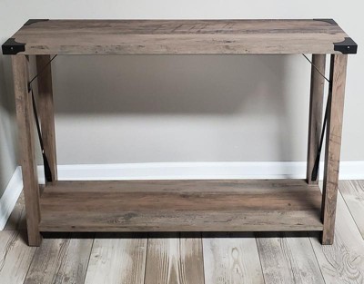 Plan a cozy gathering in your home with this trendy 2-tier farmhouse style console entryway table ideal for your living space. The warp resistant engineered wood frame with powder coated diagonal metal side bracing gives you long-lasting performance while the metal corner accents give a pop of sophistication that will always be welcome in any aesthetic. Place a unique dish for keys or an organizer for mail on the upper tier that holds up to 125 lbs. static weight while showcasing your personal style with handpicked decor on the lower tier of open storage that holds up to 50 lbs. static weight. Fixed floor glides prevent damage to your indoor flooring surfaces and a damp cloth is all that is required to maintain the appearance of your new table that assembles in 60 minutes or less. Pair with our matching coffee or side tables for a cohesive theme throughout your home
