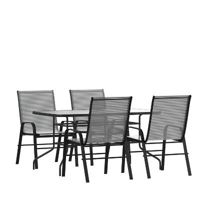 Emma and Oliver Five Piece Patio Table Set with 31.5" x 55" Metal Table with Tempered Glass Top and 4 Gray Flex Comfort Stacking Chairs