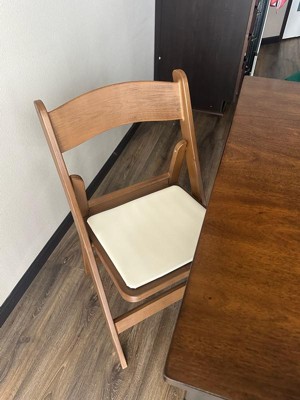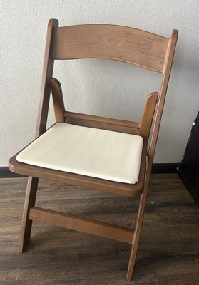 [This review was collected as part of a promotion.] I love this chair! The material blends in perfectly with my wood table and chairs, but I can choose whether to keep it at my table when guests come by, or neatly store it in my closet. The chair folds up easily and it’s very lightweight but sturdy! The seat is pretty flat, and the white is a bit risky with food, but otherwise this is a great alternative to a metal folding chair!