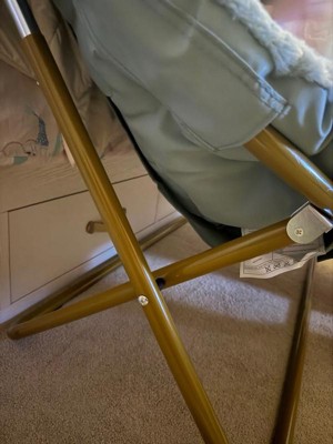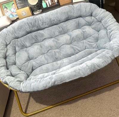 [This review was collected as part of a promotion.] This double saucer folding chair is amazing! The fabric is super cozy and soft with enough padding to make it a great lounger. The frame is very strong and built to last. It has a nice gold finish which I think gives it a high end look. It was very easy to unfold, and then refold. I love how easy it is to store too. Would fit under a bed if needed to be tucked away. I would highly recommend this double saucer!