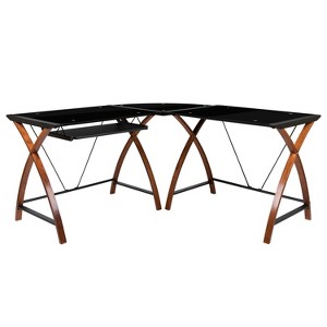 This glass l-shaped computer desk offers a great solution for the user who keeps multiple projects open or needs the extra space to accommodate all their work needs. It features 2 black tempered glass desk surfaces and corner surface that connects them, a space-saving, sliding keyboard tray and crisscross cherry finished legs. A powder-coated finish protects the frame from scratches and floor glides protect your floor by sliding smoothly when you need to move the desk. The l-shaped computer desk can be placed in the middle of the room or be used as a corner desk option. The good looks of this glass computer desk will fulfill the needs of your home office workspace