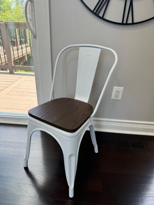 Chat among friends and family in the dining room or kitchen on these comfy colorful dining chairs. The metal chair with wood seat adds a rustic touch. Appealing in both modern and industrial spaces, if you decide to move or redesign your space these accent chairs will adapt. Completely transform your dining space with this vintage bistro style chair. Designed for commercial environments the steel frame is coated in a durable powder coat finish to endure in high traffic areas. With a 500 pound static weight capacity you'll be able to accommodate all visitors for as long as you're open for business. Whether you need furniture for your home or restaurant business you'll be more than pleased with the heavy-duty galvanized steel construction that will last for years. This stackable metal chair is ready for use in no time by using the included brackets to affix to the seat. Additional Features: Plastic Caps on cross brace protect finish when stacked, Galvanized Steel Green Powder Coated Frame Finish, Floor Glides to protect hard surfaced floors, Metal Stack Chair for kitchen, dining room, office, lobby, or restaurant