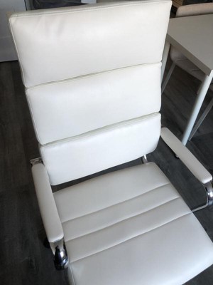 Bring your office into the new age with this stunning executive office chair. The panel back desk chair is easy on the eyes to bring instant value to your workspace. Impressive chrome arms with a padded layer provide support to your upper body while looking exquisite. Make a powerful impact in your conference room when taking meetings with clients and buyers with these high back conference chairs. Drape your jacket over the coat hanger bar to prevent from falling when getting in and out the chair. Adjust the chair to your desired height by utilizing the lever underneath the seat that also locks the chair in an upright position. When you want to lean back pull the lever out and use the knob to adjust the force that'll be required to recline. Enjoy reliable support in this ergonomic office chair to support your while addressing customer concerns and day-to-day tasks. Additional Features: Tilt Lock Mechanism rocks/tilts the chair and locks in an upright position, Tilt Tension Adjustment Knob adjusts the chair's backward tilt resistance, Pneumatic Seat Height Adjustment, 5-Star Chrome Base with Dual-Wheel Casters, LeatherSoft is leather and polyurethane for added Softness and Durability