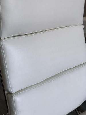 I purchased this chair because it seemed like it was an ivory/off-white hue in the photos. I also purchased it because it has a "tilt mechanism". When I received it I noticed that the upholstery was pretty snow-white. The white in person also almost seems a bit green at the creases. The hint of green is usually a sign of not-so-great-quality-white, whether it's in the paint/dye or fabric itself. (This is made in China.) Also, after sitting in the chair one time, the seat & back got really creased up and the cushions weren't well aligned. Over time I assume it'll only get worse. I also though based off the photos that these back cushions would be more tighter together, but I was wrong. The tilt mechanism might as well be non-existent. It's abysmal. You maybe tilt 5-10 degrees. It basically just feels like there's a loose screw when you try to tilt. Putting the chair together was not an easy feat either. It comes with a set of picture instructions. When I tried putting it together, I got frustrated because the screws wouldn't screw in a lot of the times, unless it was absolutely exactly at the right spot. I had to tug on the metal bar on some parts to make the screw go in place. Overall disappointed in this chair. Will be returning.