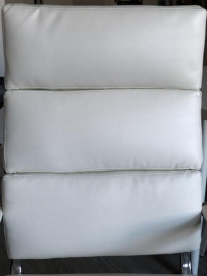 I purchased this chair because it seemed like it was an ivory/off-white hue in the photos. I also purchased it because it has a "tilt mechanism". When I received it I noticed that the upholstery was pretty snow-white. The white in person also almost seems a bit green at the creases. The hint of green is usually a sign of not-so-great-quality-white, whether it's in the paint/dye or fabric itself. (This is made in China.) Also, after sitting in the chair one time, the seat & back got really creased up and the cushions weren't well aligned. Over time I assume it'll only get worse. I also though based off the photos that these back cushions would be more tighter together, but I was wrong. The tilt mechanism might as well be non-existent. It's abysmal. You maybe tilt 5-10 degrees. It basically just feels like there's a loose screw when you try to tilt. Putting the chair together was not an easy feat either. It comes with a set of picture instructions. When I tried putting it together, I got frustrated because the screws wouldn't screw in a lot of the times, unless it was absolutely exactly at the right spot. I had to tug on the metal bar on some parts to make the screw go in place. Overall disappointed in this chair. Will be returning.