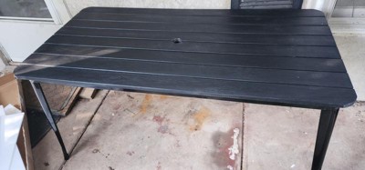 Instantly up your commercial or residential outdoor dining or lounge spaces with the upmarket look of this 30" x 60" all-weather dining table with umbrella hole. The slatted poly resin top paired with a steel frame lends a contemporary yet rustic look to any decor from industrial to farmhouse. Create a fun spot to have drinks or dinner for 6 in your outdoor patio dining areas. Designed to stand up to the rigors of the hospitality industry, as well as busy households, this commercial table boasts a polystyrene top that will not rot, chip or peel with an umbrella hole that can be used with multiple umbrellas and bases while the 20 gauge steel frame holds up to 300 lbs. static weight capacity. Stainless steel hardware is rust resistant making this patio table ideal for year round use both indoors and out. Assembly takes less than 10 minutes with the included tools and cleanup is a snap with a damp cloth for quick seating turnaround. Adjustable floor glides ensure a stable, level surface and protect your indoor flooring from damage. Pair this table with other sizes or shapes in our collection for a cohesive look throughout your home or business.
