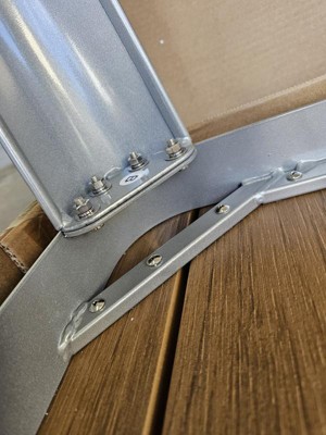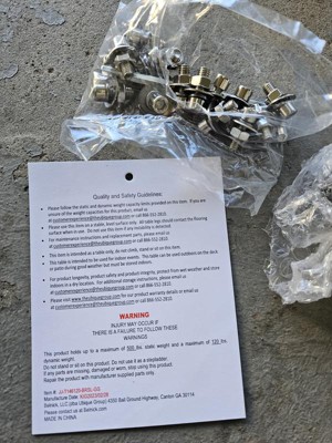 [This review was collected as part of a promotion.] Nice solid table. It should have had double the amount of washers for assembly but after some thinking I decided to use them on the nut side facing the ground. There were no instructions for assembly. I was disappointed the table was marketed for outdoor use and then the paper that came with it contradicted it. We have it outside in a covered spot. It's solid and looks nice. Easy to wipe off.