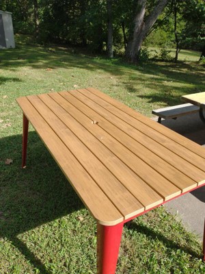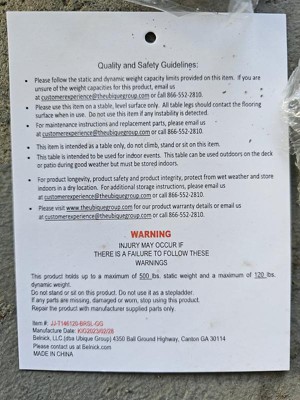 [This review was collected as part of a promotion.] This table is a nice, sturdy table for outdoor use. The colors are nice and muted to fit in well with my outside space. Not shiny and fake looking like some furniture is. I was pleasantly surprised at how easy it was to put together. I actually did it all by myself. The legs are angled, so don't put it somewhere where you are planning on pushing it against a wall. Overall, I would give it an A rating for esthetics and sturdiness.