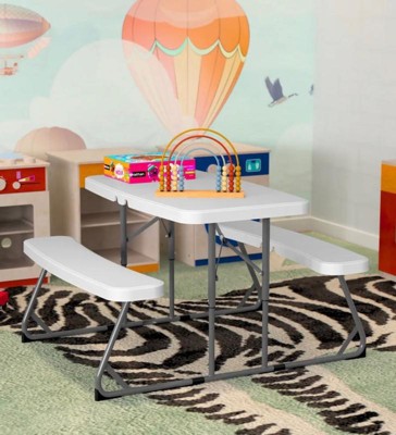 Kids need seating that is just their size to eat and play so adding this folding picnic table with benches to your home, school, or daycare is a wise investment. The white plastic tabletop and bench seats are waterproof as well as impact and stain resistant. Suitable for indoor or outdoor use, this kids activity table is also weather-resistant, though care should be taken to protect the frame from prolonged periods of wet weather. Health and safety are always considerations when purchasing products for children. This picnic table boasts a welded, powder coated steel tube frame that allows the tabletop to hold up to 225 lbs. static weight capacity while the benches hold up to 132 lbs. static weight. With seating for 4, this foldable picnic table is suitable for children up to 5 years of age and features locking legs to avoid accidental collapse. The versatile design of this kids table makes it ideal for use in playrooms, living rooms, or in the dining room. Cleanup is quick and easy with a damp cloth and best of all, no assembly is required. This multipurpose table folds flat for hassle-free storage and transport.
