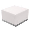 Your lobby or reception area is the forefront of your business and providing distinguished and comfortable seating is the first step towards making a great impression. Featuring a taut seat and back with foam filled cushions, these chairs provide optimum support for long hours of sitting. This collection offers modular pieces that will allow you to reconfigure the space to accommodate your guests as your business grows. Purchase this complete set and add on any additional pieces now or later. Additional Features: Melrose White LeatherSoft Upholstery, Exposed Embellished Stitching, Taut Back and Seat, Foam Filled Cushions, CA117 Fire Retardant Foam, Locking Bolt Connects Chairs, Brushed Stainless Steel Base with Adjustable Floor Glides, LeatherSoft is leather and polyurethane for added Softness and Durability, Set Includes:, Ottoman: (4), Overall Size: 25.5"W x 25.25"D x 16"H