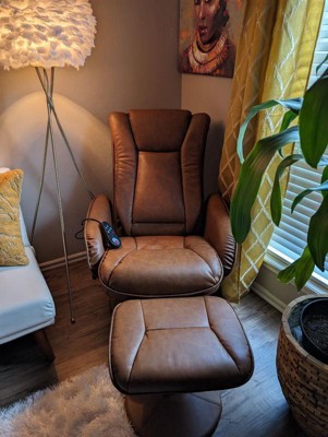 Those who say you can't have it all never met this massaging recliner and ottoman set. This therapeutic recliner is a comfortable place to spend some quality time, while you enjoy a relaxing massage in the comfort of your home or office. Put in your Bluetooth headphones, dim your smart bulbs and let this massaging recliner do its job. This set delivers maximum massaging power to your back, lumbar area, thighs and legs with 9 massage modes and 5 intensity levels. Simply press the buttons on the remote control to turn up the heat, choose your custom massage options and set the timer. The double padded seat and back, integrated headrest and plush upholstered arms give this luxurious chair and ottoman an extra level of comfort to welcome you in. Assembly of this extraordinary massage chair and footrest takes less than an hour and spills are easily cleaned with a water based cleaner. Turn up your favorite music or podcast and let the tensions of the day slip away.