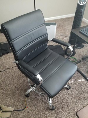 Be comfortable and stylish whether you're working at your desk or higher surfaces with this height adjustable drafting chair. Covered in soft and durable black LeatherSoft upholstery with ribbed stitching, this modern drafting chair brings subtle sophistication to any area. The padded arms provide tension relief for your neck and shoulders to ease strain and help maintain productivity. Working long hours can be stressful on the mind and body so comfortable seating is a must. The contoured mid-back design provides built-in lumbar support while the height adjustable foot ring and waterfall seat will ease pressure on your legs no matter your seat height. Adjust the seat from counter to bar height with the pneumatic lever under the seat and reach any work surface with the 360° swivel. The chrome column atop a 5-star chrome base with dual-wheel casters will provide stable seating and smooth movement to get you where you need to go. Be ready to work in 30 minutes or less with the included step-by-step illustrated instructions. Wipe down your new drafting chair with a damp cloth to keep it looking new