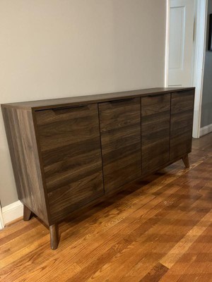 Decorating and furnishing your home is a reflection of who you are and what you love. The on-trend style of this multifunctional 4 door buffet cabinet is just as unique as you are. Whether placed in your kitchen or dining room as a traditional buffet or your living room for additional storage or as a TV stand, this piece will blend seamlessly with its mid century modern appeal. Never worry about your keepsakes and treasures with the strong durable engineered wood frame with soft close doors. Capable of holding up to 200 lbs. static weight, this storage cabinet is ideal in any space. Adjustable inner shelves hold up to 25 lbs. static weight and provide extra space for unwanted clutter, linens, or remote controls. Plastic floor glides prevent damage to hard indoor flooring surfaces, assembly takes less than an hour, and cleanup is quick and easy with a dry cloth