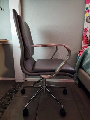 [This review was collected as part of a promotion.] This chair is so pretty and nicely designed. The seat looks and feels like leather - so buttery smooth - and is extremely comfortable with plush padding on the seat and back. The design is so sleek; I love the contrast with the chrome. The base is adjustable so I can slide it under my desk then raise as needed when using it. I have looked everywhere for the perfect desk chair and finally found it! It desk require assembly of the base and arms but that is simple and straightforward, taking just minutes. It gave my office an instant upgrade. I love this chair! Thank you!!