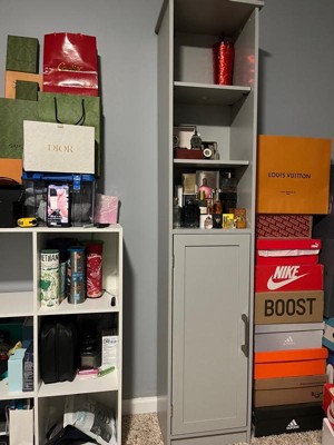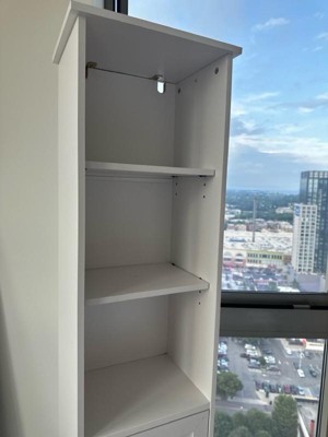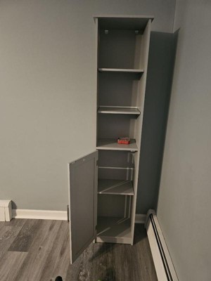 [This review was collected as part of a promotion.] I was super excited to receive this slim shelf/cabinet for my home! My husband assembled this product within an hour — found it simple, hardware matched up with wood, etc. Easy to follow instruction manual was included. Three small open shelves make up the top of the unit and the bottom is complete with a cabinet door and two shelves within. It’s tall, but not wide — it is functional for smaller spaces and holds smaller items. I wouldn’t consider this the best cabinet size for linens or towels. I chose the nice white finish, but I noticed gray was also an option. The cabinet seems sturdy and includes hardware for mounting it to the wall to avoid any tipping. Very happy with this product.