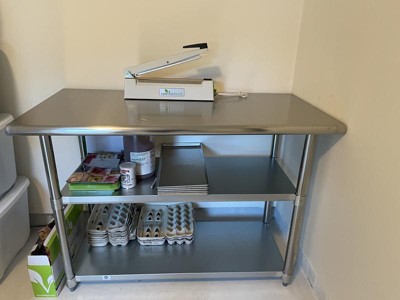 Give yourself some extra space for home-based catering and increase functionality in your kitchen with this stainless steel work table with 2 adjustable undershelves. This stainless steel prep table is a great space for bulk food preparation or for storing unused appliances or utensils. This steel table can be placed against a wall or used as a freestanding kitchen island. This metal utility table resists corrosion and holds up to 600 lbs. while each of the undershelves hold up to 200 lbs. The stainless steel is certified to NSF quality standards. Rounded corners prevent scrapes and cuts and this work table assembles in under 10 minutes with the included tools. Adjustable feet adjust up to 1" to provide a level work surface. Remove any traces of food contaminants with water and a neutral detergent followed by a dry cloth. Additional Features: Undershelf Size (2): 41.25"W x 16.125"D x 4"-28"H, Cleans Easily with Water and a Neutral Detergent Followed by a Dry Cloth, Assembles Quickly in 10 Minutes or Less, Stainless Steel Work Table for your industrial kitchen island, weekly food prep, laundry folding or extra pantry room.