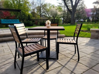 [This review was collected as part of a promotion.] I just pulled chairs and table out. It is very durability. A table comes with 3 boxes. It is easy to assemble and the base is little bit heavy to hold everything together. I don’t have to worry about cover patio chairs and tables anymore because material is weather resistance.