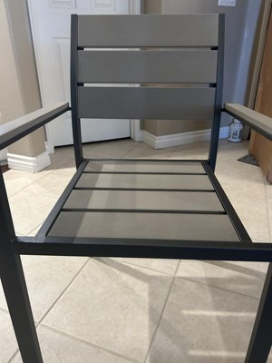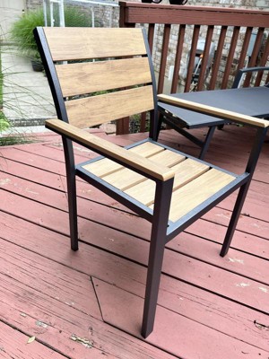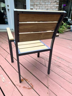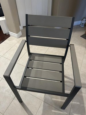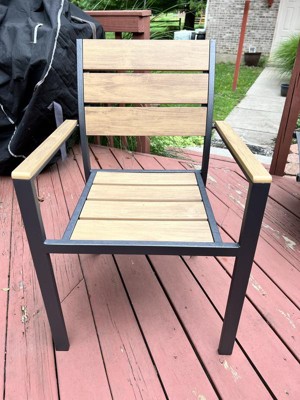 [This review was collected as part of a promotion.] I have the Finch Commercial Grade Patio Chair with Arms. These chairs are a stackable type side chair with faux teak poly slats and a metal frame. I love the color it is a natural/gray color which goes with everything really well. This design is very effective against all of the weather elements. I would highly encourage everyone to try these types of chairs out to give you a beautiful upgrade to ordinary type lawn furniture.