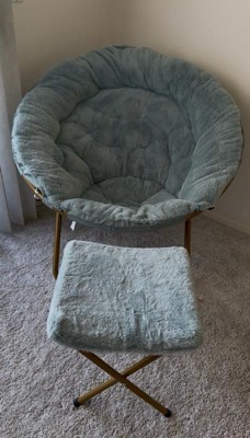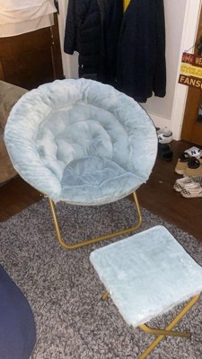 Emma and Oliver Oversize Faux Fur Folding Saucer Moon Chair with Ottoman for Dorm and Bedroom, Dusty Aqua Faux Fur/Soft Gold Frame