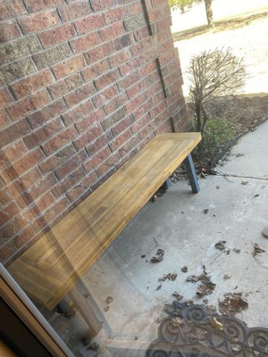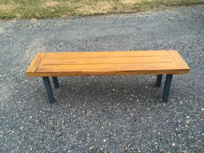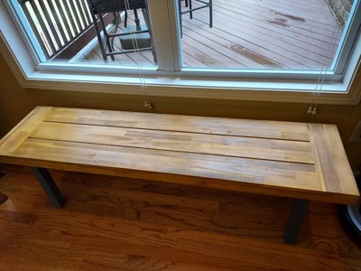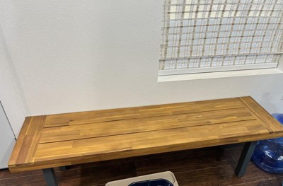 [This review was collected as part of a promotion.] I have the Martindale Acacia wood patio dining bench and I am pleased with it. The wood is beautiful and better than I had expected. The legs are black and attach quickly and easily, and that is the only assembly needed. Hard plastic pads come on the bottom of the legs to keep from scratching the floor. The description says it's a 2 person bench, but it is fairly long and could easily sit 3 people. It feels sturdy and a quality product. The bench looked so nice that my wife decided to use it indoors as an accent piece instead of on our patio.