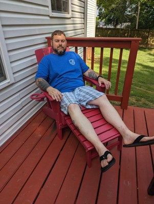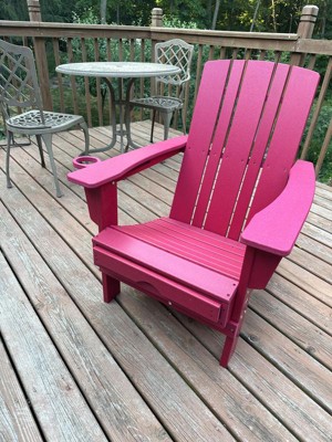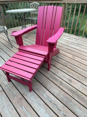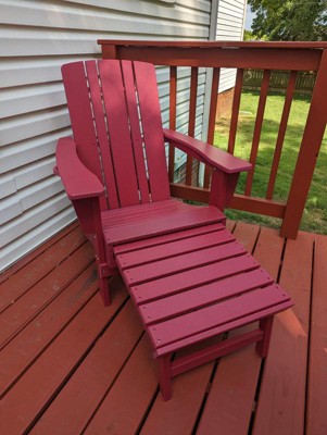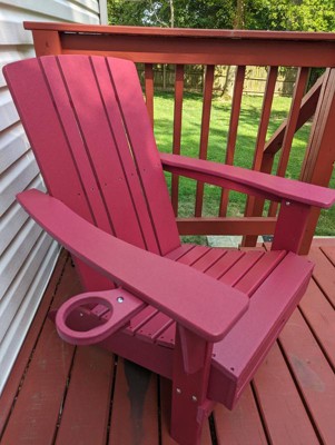 [This review was collected as part of a promotion.] This is perfect for a certain height or below. My husband is 6 ft and 240 lbs while I am 5'3. He fits in it, but not as comfortably as he wishes. As for myself, I find the chair comfy! I like the added cup holder and the ability to pull out the footrest part or leave it simply as the Adirondack chair. The chair was really easy to assemble and didn't take but 15 minutes with very little work required. It's not wood, but it's not plastic, so it has been subjected to the sun and rain here in Tennessee and is still holding strong. It's not quite red as much as it is a coral color; more pink then red. It's nice though and has made a great addition to the evening dinners on the porch!