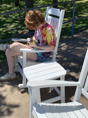 Enjoy the view from your front porch or back deck with this set of 2 poly resin rocking chairs with an included accent table. The design of this seating set is a timeless classic and will create a soothing atmosphere. A perfect addition to your patio, deck, or sunroom, this versatile indoor/outdoor conversation set invites you to settle in and stay awhile. No matter where you choose to spend your free time comfort is essential. These rockers have a full-back design for full support while the sloping runners provide a smooth rocking motion for full relaxation. The handy slatted top side table holds your drinks, snacks or your latest read. Boasting a faux wood look that is UV protected and constructed of weather-resistant polystyrene, this patio table and chair set is designed to hold up in many environments. Unlike traditional wood furniture there is no back breaking sanding, painting or sealing and this low maintenance table and 2 chair set won't rot, peel or splinter. Easily clean spills, dirt, or dust with water and a neutral detergent. Assembly takes less than 30 minutes with the included tools and illustrated instructions. This all-weather indoor/outdoor seating set beckons you to unwind and let go of the day.
