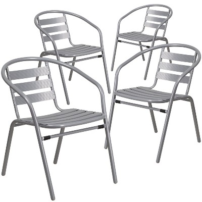 Emma and Oliver Silver Metal Dining Chair with Triple Slatted Back and Armrests for Indoor and Outdoor Use
