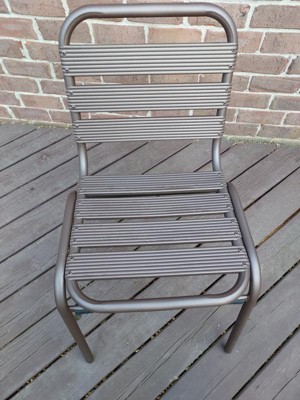 [This review was collected as part of a promotion.] Great patio chairs. They are very well made and sturdy. I think the light weight metal will hold up well to the outside elements. I love the contemporary look and that they are stackable for easy storage.