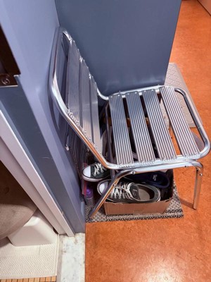 [This review was collected as part of a promotion.] The chair is very lightweight, I use it indoors and it fits perfectly in a corner next to the door so it’s perfect for sitting to put on my shoes on my way out. Since it’s metal I’m sure it’s easy to clean, I don’t need to stack since I only have one but I’m sure it stacks well.