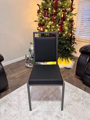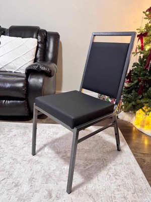 Refresh your reception venue with this elegantly styled ballroom chair. The commercial grade banquet chair with square back design fits well in formal and casual settings from wedding ceremonies to corporate meetings and awards banquets. This standout hospitality chair can be used as is and still command attention or be dressed up for formal events by placing a chair cover over it. Accommodate everyone who visits your venue with this sturdy banquet stack chair with CA117 fire retardant foam cushioning, and 16-gauge steel, powder coated frame, that has been tested to hold up to 600 pounds. Double support braces reinforce the frame to give it great strength and durability. For high use venues, the beautiful frame will be maintained with the included bumper guards that prevent scratches on the frame when stacked (up to 15 high) and non-marring floor glides protect your flooring by sliding smoothly when you need to move the chair. This modern upholstered banquet chair is ideal for churches, banquet halls, wedding receptions, training seminars, hotels and convention centers. Adding metal banquet chairs to your home's dining table will add an elegant appearance to your dining room or kitchen. Additional Features: Silver Powder Coated Frame Finish, Floor Protector Plastic Glides, Limited Lifetime Warranty on Frame, Designed for Commercial Use; Suitable for Home Use, Ships Fully Assembled