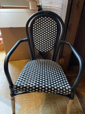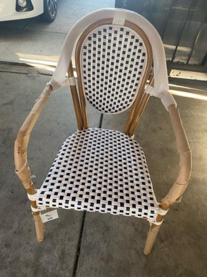 Bring the street vibes of Paris right into your restaurant, bistro, hotel, or backyard patio with this indoor/outdoor commercial grade bistro chair. The durable PE rattan Thonet-style back and seat are very comfortable and won't fade when used outdoors. The lightweight, but sturdy, powder coated metal frame boasts a bamboo look finish, holds up to 400 lbs. static weight, and will not rust. Recommended stack height for this chair is up to 5 high for storage or transport. Two curved arms deliver additional comfort and structure. For your convenience, this chair arrives completely assembled for instant use and features floor protector glides to prevent damage to indoor hard flooring surfaces. This dining chair easily wipes clean with a damp cloth for quick seating turnaround.