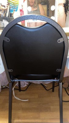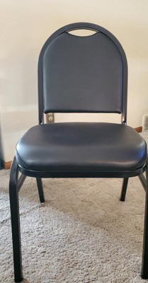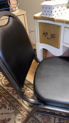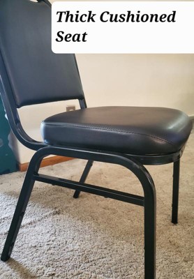 [This review was collected as part of a promotion.] This is a sturdy comfortable chair. It's quality constructed with a steel frame and sturdily welded. The seat is nicely padded with thick firm foam and and meticulously finished with a leather like material that appears like it would last a long time. The chair is comfortable for hours of sitting if necessary. It's sturdy and rated to hold up to 500 pounds of static weight. It's nice to have extra chairs for guests that require a higher weight rating and allows easier mobility. May also prevent other furniture from damage. It's always nice to have extra chairs when you have guests. It does appear that these would be stackable too, to save space when storing, if you wanted to purchase multiples. The top of chair has a built in handle for easy moving. The leg bottoms have protectors to prevent floor damage. I would recommend this chair for anyone looking for extra chairs because they are quality constructed and comfortable.