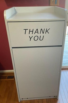 Keep your restaurant, cafeteria or break room neat and tidy with this large capacity gray finish trash can. Designed for high traffic areas, this push door receptacle will be the perfect addition in many environments. The "Thank You" text engraved into the swing door encourages people to place trash in the receptacle. Adding to the functionality of this piece, the top is designed with a raised lip for food trays to prevent accidental disposals. This can holds up to 36 gallons and the front door allows for easy removal of trash. Floor glides will keep your flooring safe when the can is moved.