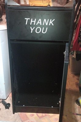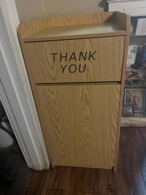 Keep your restaurant, cafeteria or break room neat and tidy with this large capacity oak finish trash can. Designed for high traffic areas, this push door receptacle will be the perfect addition in many environments. The "Thank You" text engraved into the swing door encourages people to place trash in the receptacle. Adding to the functionality of this piece, the top is designed with a raised lip for food trays to prevent accidental disposals. This can holds up to 36 gallons and the front door allows for easy removal of trash. Floor glides will keep your flooring safe when the can is moved. Additional Features: Holds up to 36 Gallons, Accepts 36 Gallon Plastic Liner (Not Included), Constructed of .6875" thick melamine laminate wood, Oak Melamine Finish, Floor Glides protect floors, Easy to assemble