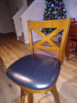 Product Name: Emma and Oliver Wooden Crossback Bar Height Pub Style Barstool with Black Padded Faux Leather Swivel Seat in Antique Oak