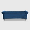 The classic chesterfield sofa receives a modern twist with the Emma sofa. This distinctive piece is upholstered in a soft, sumptuous velvet fabric and padded with plush foam. Elegant button tufting and rolled arms allude to traditional design, while silver metal nailheads lend a modern touch. Exquisite black ring turned feet complete the look of this stylish sofa. The Emma sofa is made in Malaysia and requires assembly. Dimensions: 29.13" high x 83.07" wide x 31.1" deep; Seating dimensions: 64.96" wide x 23.62" deep x 16.93" high (from Floor); Arm height: 29" high; Back: 15" high; Legs: 6.5" high;