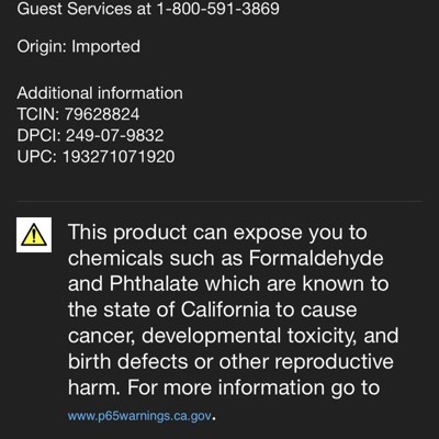 WARNING:This product can expose you to chemicals such as Formaldehyde and Phthalate which are known to the state of California to cause cancer, developmental toxicity, and birth defects or other reproductive harm. For more information go to www.p65warnings.ca.gov. For more information, go to https://www.p65warnings.ca.gov/