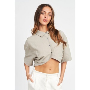 Upgrade your Fall wardrobe with this cropped Button down from Emory Park! Made in a lightweight fabric for all day comfort. Features oversized short sleeves, collared neckline and tortoise buttons. Pair with high waisted jeans and sneakers for the perfect casual look!