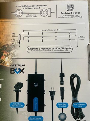 - All-in-One Kit — Two 16.5ft. black strands, eight total LED pucks, durable stakes, power supply and 10ft. extension cable are included to enjoy straight out of the box