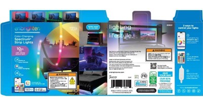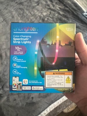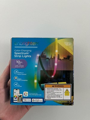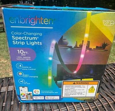 Color your world with Enbrighten VIBE Spectrum Strip Lights! Featuring easy customization and an effortlessly sleek design, this color-changing strip of RGBIC LEDs transforms your space, highlighting your own vibrant style. Using your 2.4GHz Wi-Fi network, experience hassle-free pairing to the Enbrighten app, which is available in the Apple App Store or on Google Play. Through the app, access an impressive array of colors, effects, speeds and preset modes, as well as dimming, scheduling, automations and voice activation with Amazon Alexa and Google Home. Additionally, the in-line controller and infrared (IR) remote control (CR2025 battery included) provide alternate ways to operate your strip lights. This 10ft. light strip can be cut to length and is easy to install indoors on a clean, dry surface using its adhesive backing and mounting clips. These flexible LED tape lights are the perfect way to enhance your gaming station, streaming setup, home theater, living room and more. The thin tape light can easily bend around corners as a colorful accent for desks, entertainment centers and baseboards or extended in a straight line. Experience the fun of smart, colorful indoor lighting with the Enbrighten VIBE Spectrum Strip Lights — where lighting meets lifestyle.