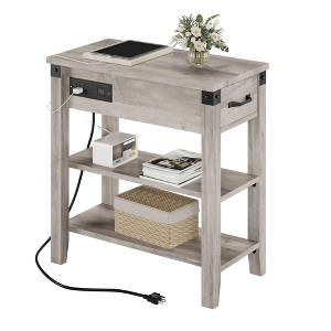 End Table with Charging Station, 3-Tier Narrow Side Table with Drawer and Storage End Table Wood Farmhouse Bed Side