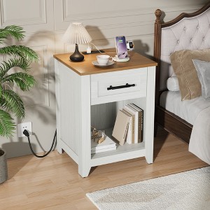 Farmhouse Nightstand with Charging Station – 2 Drawers & Open Shelf, USB/Type-C/AC Outlets, End Table for Bedroom, Living Room