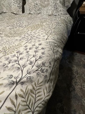 The English Forest Natural Duvet Cover Set by Levtex Home is sophisticared modern. Offered in grey, charcoal and green, this design will immediately transform your bedroom. Made with a soft and luxurious cotton, this duvet cover set features a a bountiful array of foliage, branches and flowers. It has a modern botanical on the front and a small grey diamond print on off white on the reverse. It closes with easy to use, durable buttons. The English Forest Natural Duvet Cover Set is machine washable and includes the duvet and pillow cases. Enjoy this for years to come!